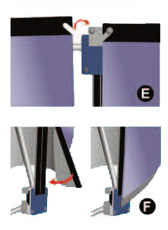(7) Panels and endcaps are marked on the back ,Beginning with the center panels and working outward, hook each panels over the pegs on the hanging brackets.(E)